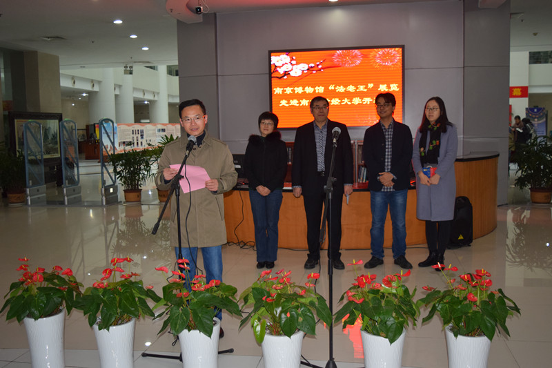 南京博物院社会服务部主任助理陈刚发表讲话说,“法老·王——古埃及文明和中国汉代文明的故事”是南博最近推出的展览,通过实物、图文等方式揭示古埃及和中国汉代文明差异,体现不同文化背景下的相同文化认知。此次展览进校园活动系博物院第一次与高校合作展览,对我校浓厚的人文氛围、优质的展览环境和师生们的热情给予了很高评价。