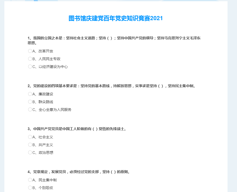 为了庆祝中国共产党的百年华诞,贯彻落实学校党委和图书馆党总支关于党史学习教育的部署,深情回顾党的百年奋斗历史,热情讴歌党的光辉业绩,以积极昂扬的姿态迎接建党百年,图书馆分工会于9月28日举办了线上的党史知识竞赛活动。