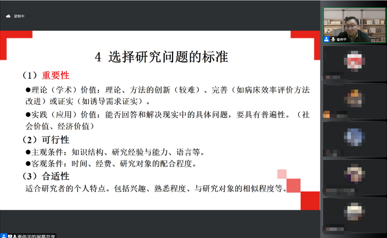 秦伟平教授首先用多个案例分析了什么是优秀的研究问题,他指出可以从现实社会生活、个人特定经历、各种文献资料等方式来选择研究问题,同时,分享了寻找研究问题的若干便捷方法。他总结了选择研究的标准:重要性、可行性、合适性和创新性。