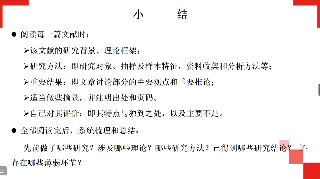 秦教授从文献回顾的概念、文献回顾的作用、查找相关文献、对文献进行选择等方面介绍了如何查找和阅读文献。他通过示例,分享了文献综述的正确写法,指出文献综述应该包含“前言”、“文献描述”、“文献评论”、“总结”和“参考文献”。