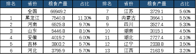表1 2020年全国粮食产量两千万吨以上省份 单位:万吨